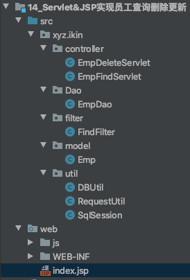以这样的一个业务为例,很明显Servlet不适合作为view,在Servlet中添加HTML代码会大大降低代码的可阅读性与可维护性。Servlet主要扮演的角色就是controller层,由Servlet决定调用哪个dao来处理业务(一般MVC框架下应该是调用service,但是本项目中并没有对service进行体现,因此controller直接调用了dao层),然后决定使用什么view返回给浏览器。